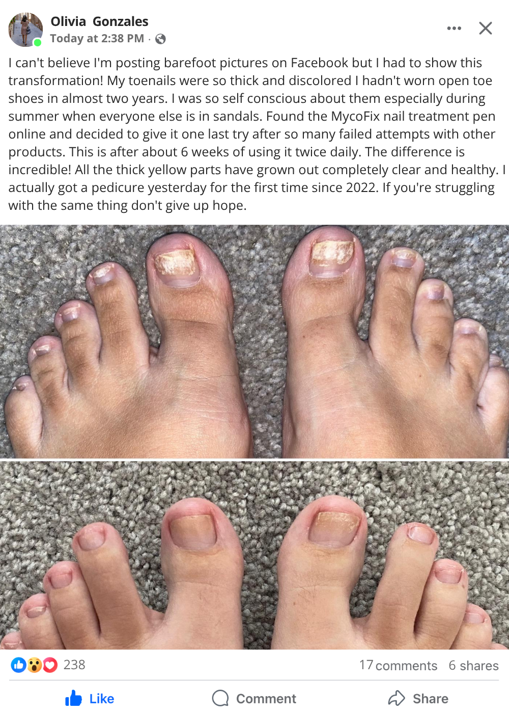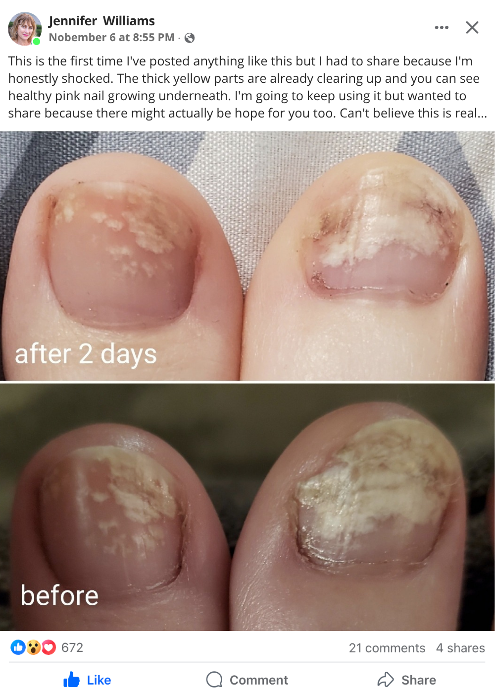 Had one stubborn toenail for years. Been using this daily and it’s almost back to normal color now.